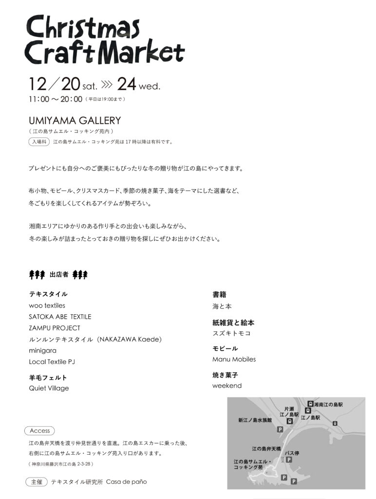 Kamakura textile research institute Casa de paño will be holding a special winter event, "Christmas Craft Market," at UMIYAMA GALLERY in Enoshima Samuel Cocking Garden.